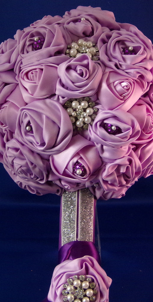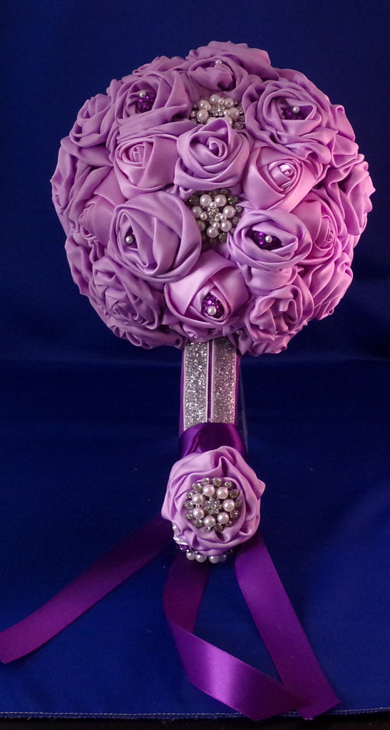 Handmade out of satin ribbon 40 open roses, with 4 closed roses. Perfect for that soft look, for an indoor upscale setting. Handle is embellished with silver sparkle ribbon. The centers of some of the roses are purple berry buttons. 4 medium sized pearl jewels. All roses pinned with pearl head pin to a 5" styro foam ball. Length: 16", Round 32", Weight: 1-2 lbs..
