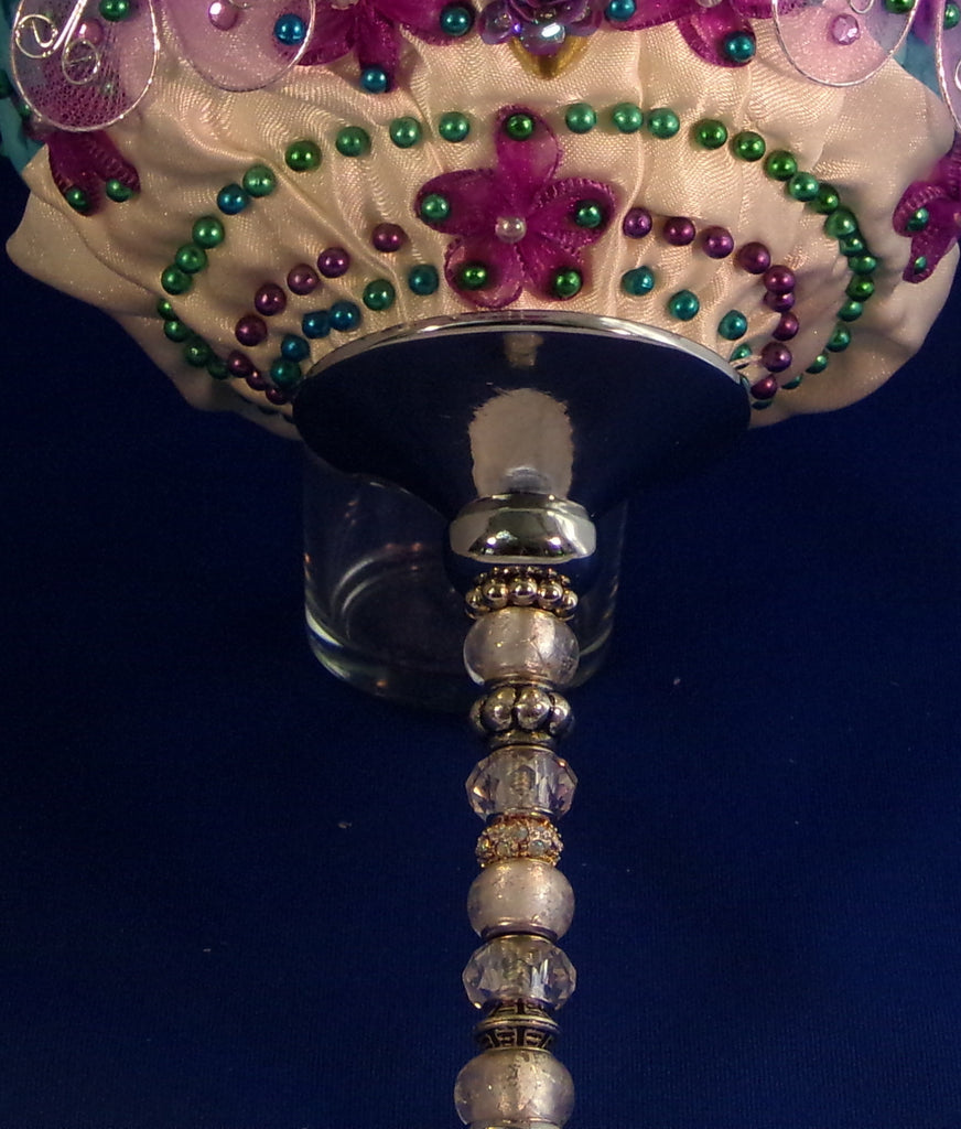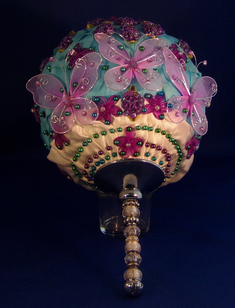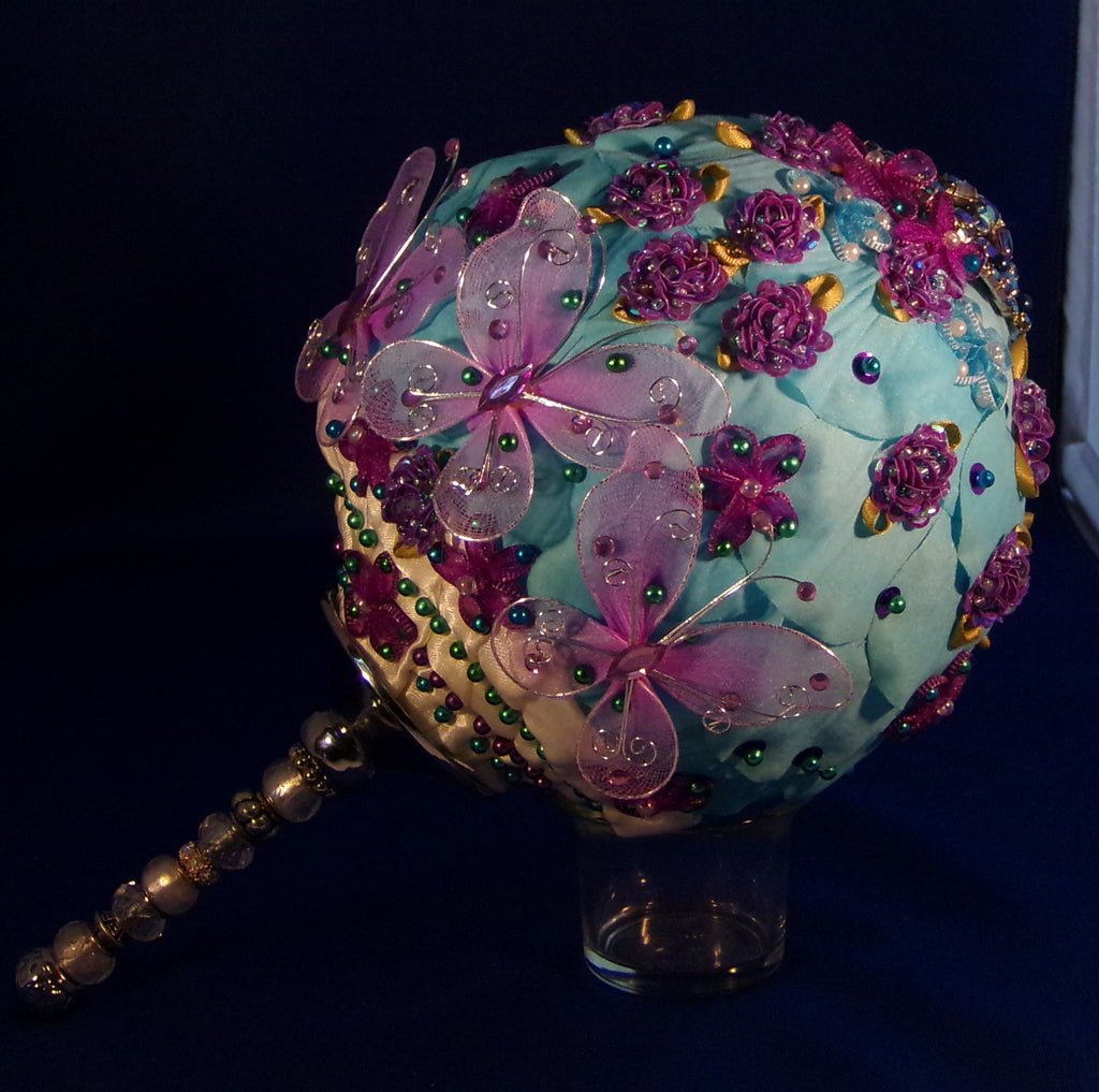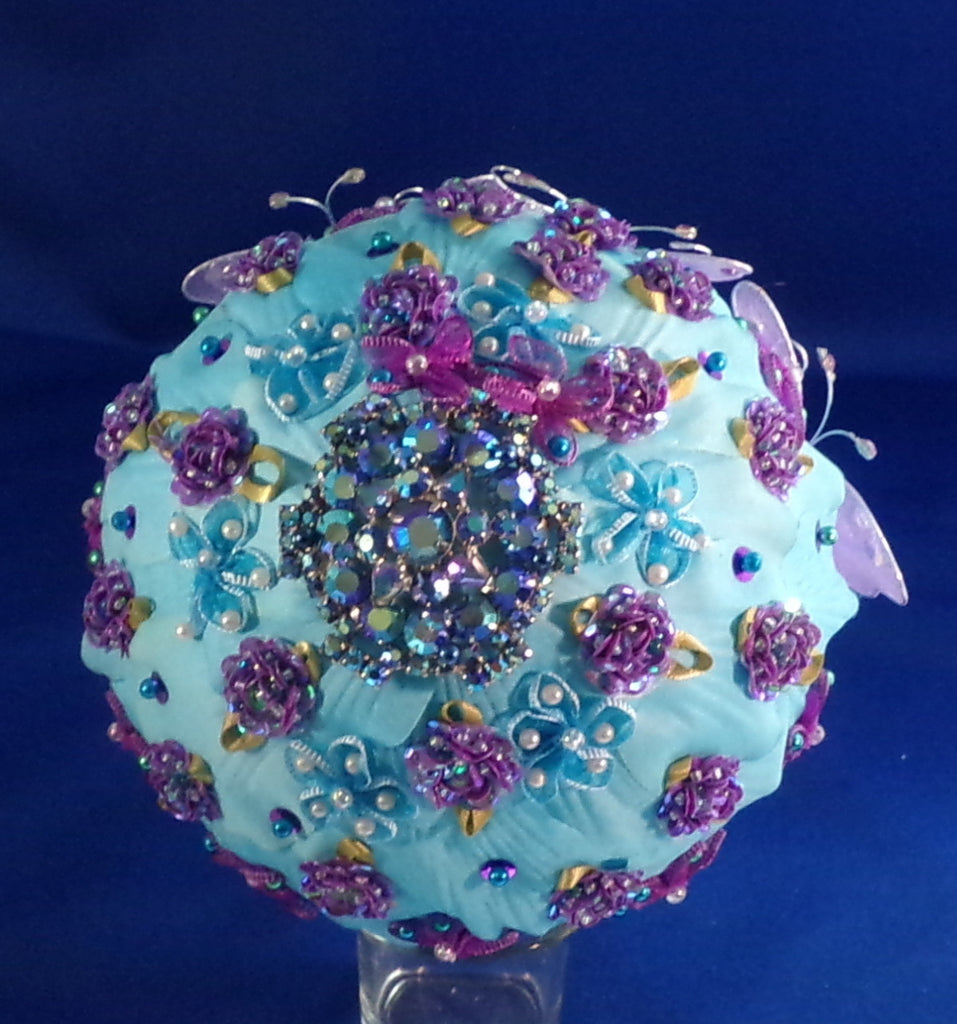Whimsical, like Alice in Wonderland, feel. Made with individual fabric blue petals pinned with purple, white, blue pearl pin heads. The purple raspberry's are sequence fabric buttons. The top of the bouquet has a dazzling sparkle large brooch. The front of the bouquet has 3 small delicate purple butterfly's to make this a fun to carry bouquet. Everything is on a 5" styro foam ball placed on a silver metal & jeweled 5" handle. It measures from tip to bottom 13" and weighs approximately 2 lbs Perfect for the fun Bride,