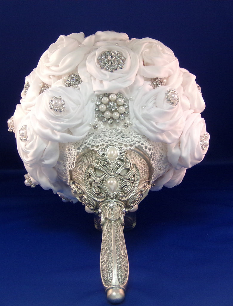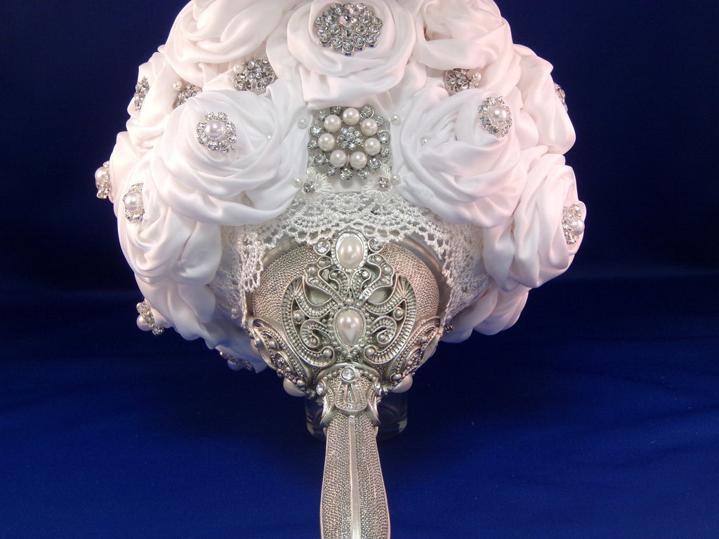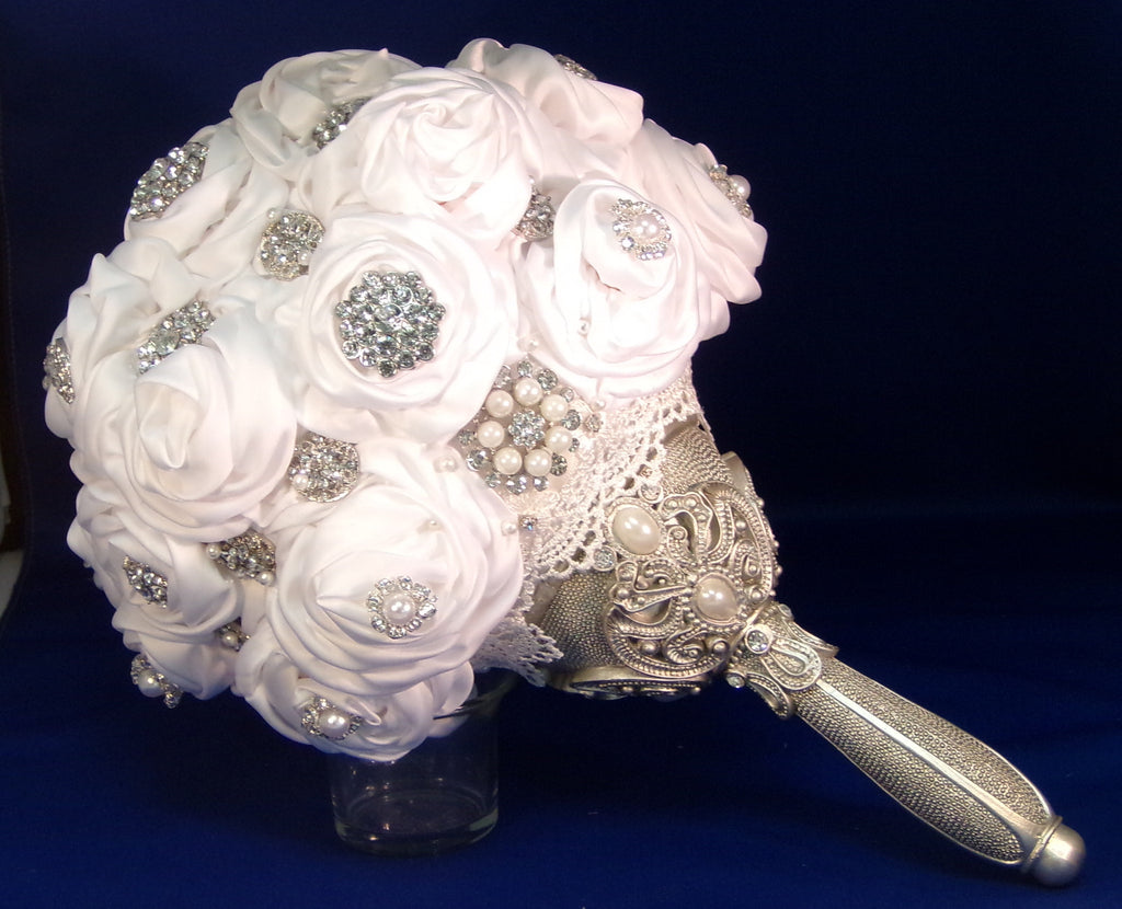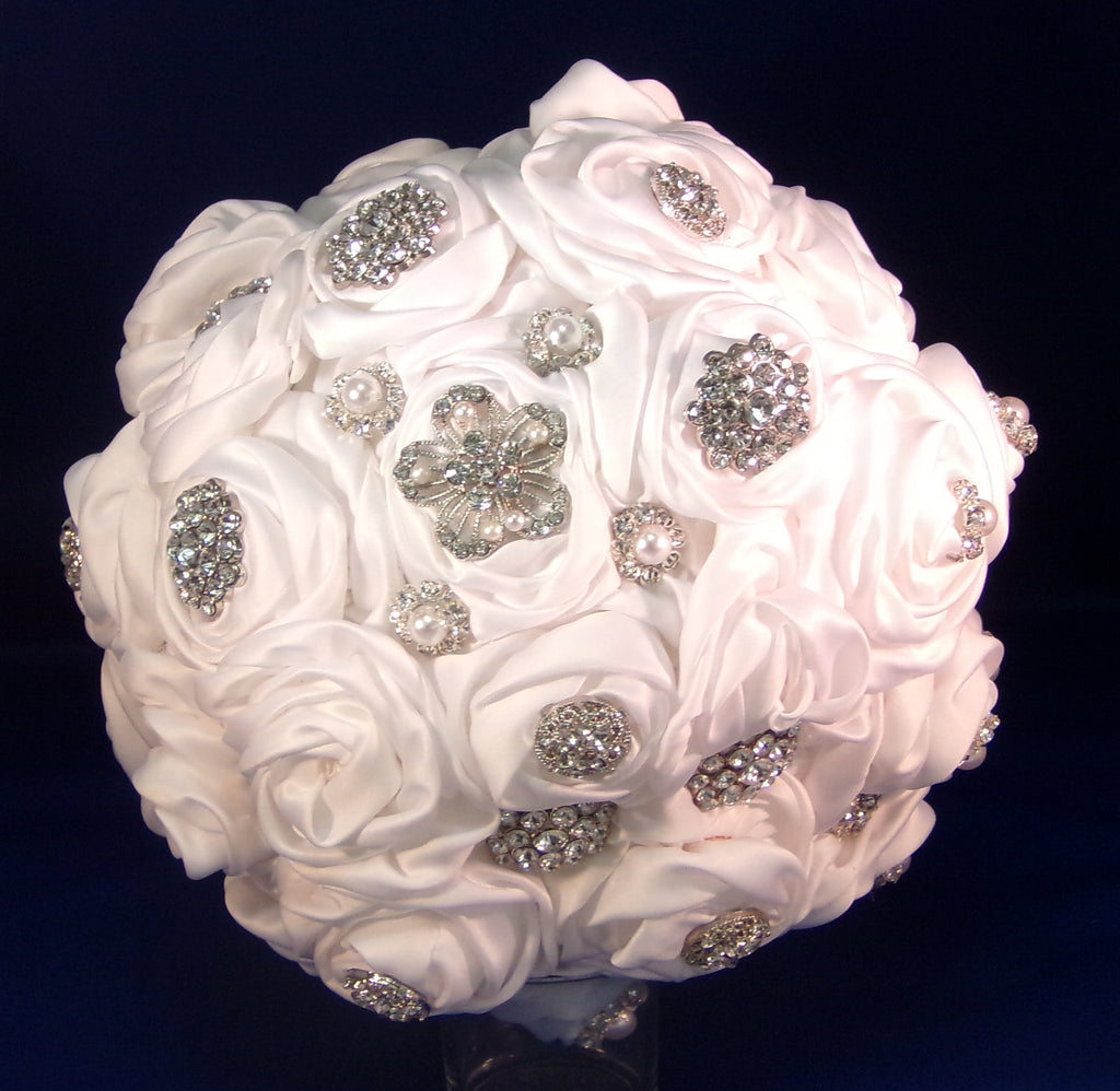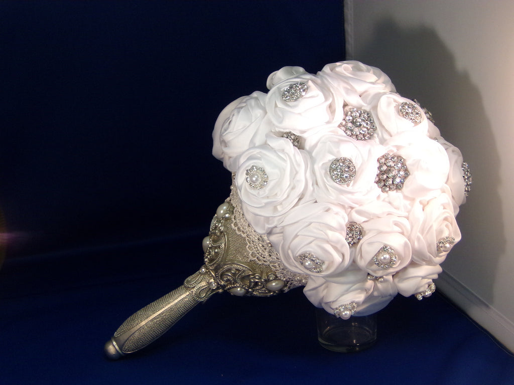 Upscale satin white rose, soft to your touch, embellished with so much sparkle, you need sunglasses to see it. The handle is to die for, over abundance of satin roses are attached to a 5" styro foam ball by white pearl head corsage pins, sparkle brooches, buttons and lace, with a touch of pearls are found throughout the bouquet.