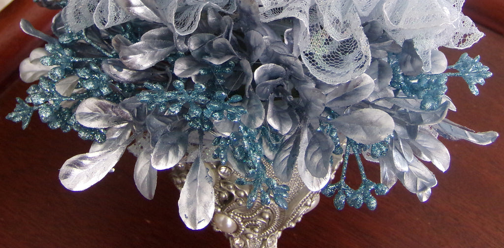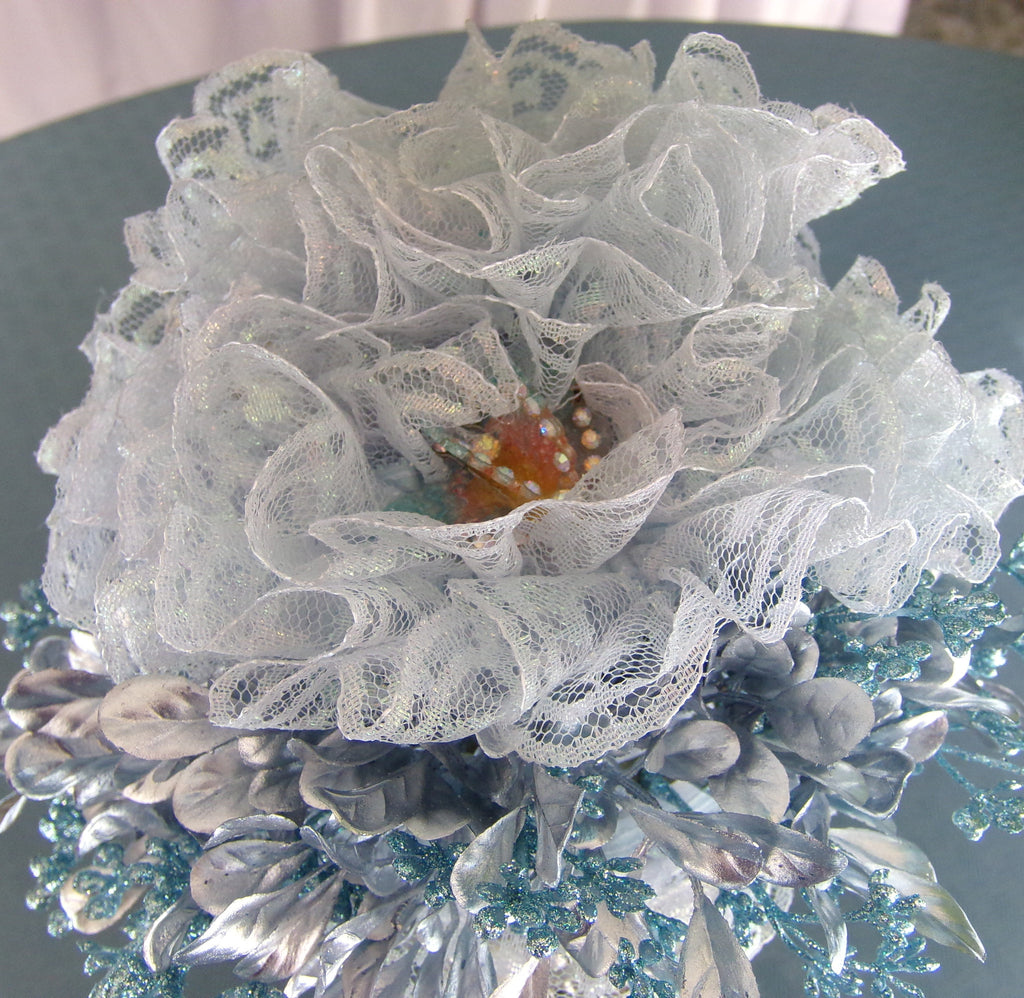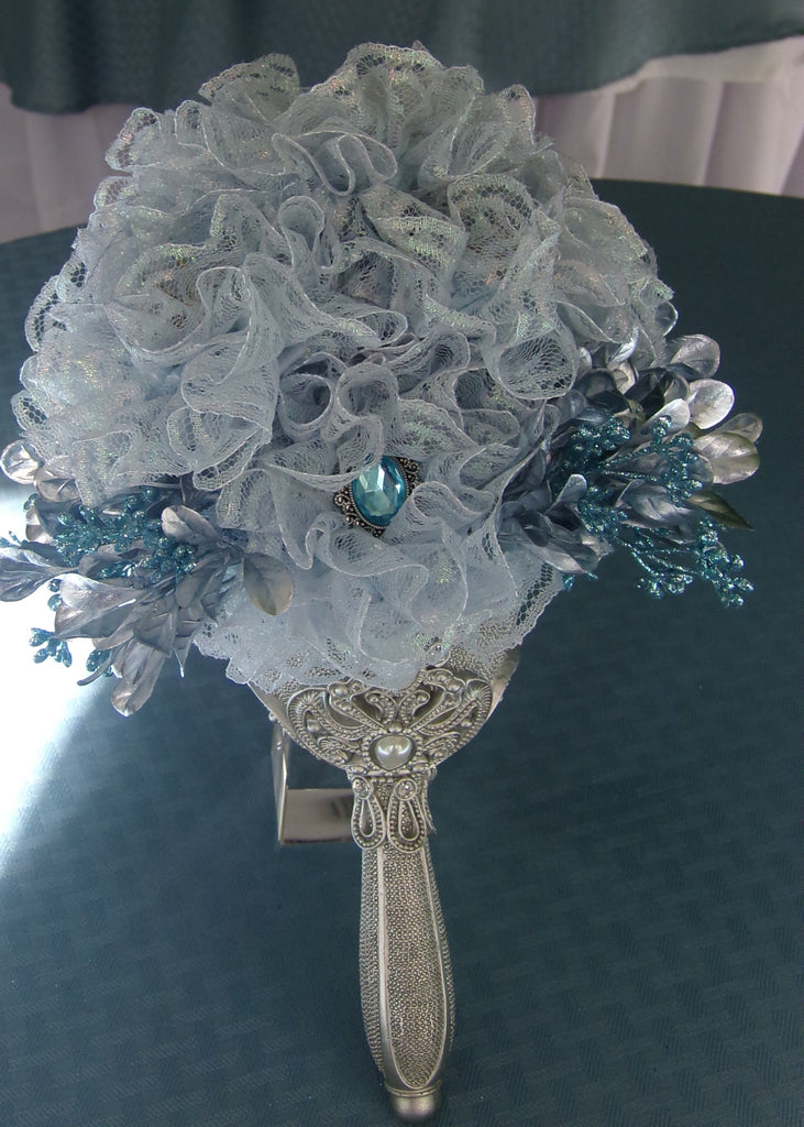 Individually handmade shimmered lace flowers, pinned with pearl heads to a white styro foam ball, embellished with 3 vintage glass butterfly's. Blue - Green, silver metal handle. Length: 14", Round: 26", Weight approx: 4 -5 oz.