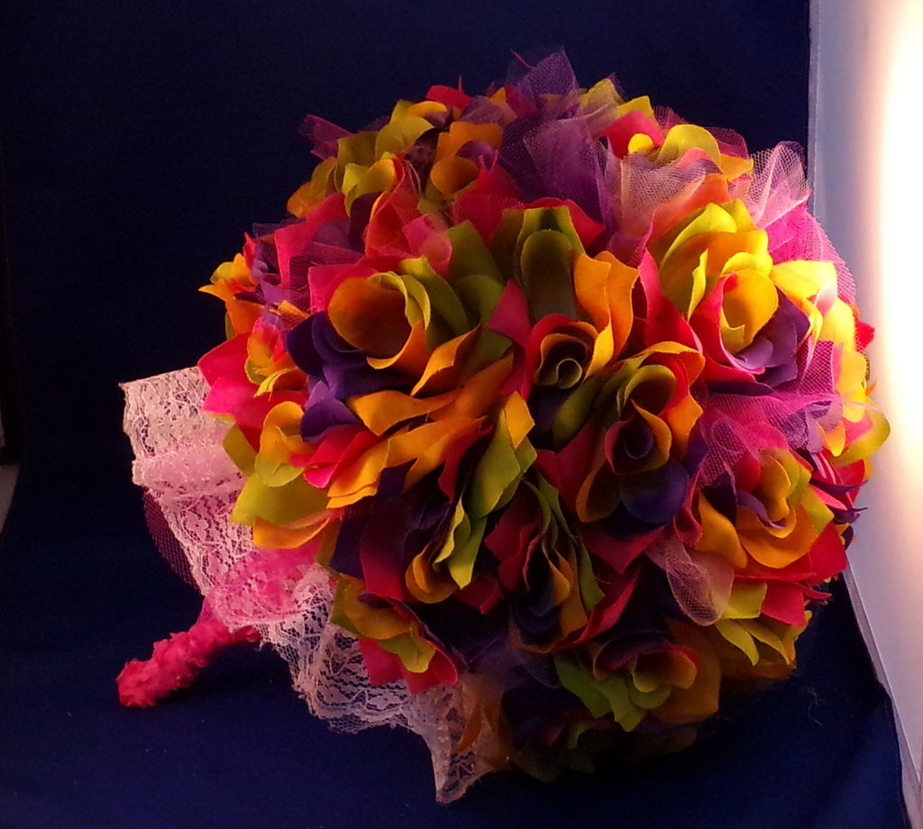 Love color? Love Roses? walk down the aisle with this amazing multi colored pink, purple, green, yellow rose bouquet. We used 3 dozen individual silk roses attached to a 6" styro foam ball, the handle is made of wood dowels, wrapped in pink seam tape. You have bling at the top with a multi colored glass brooch. Pink, white and purple tulle circles are found tucked in throughout the bouquet.This bouquet is very round and full. Perfect for the bride looking for added color to her wedding day.